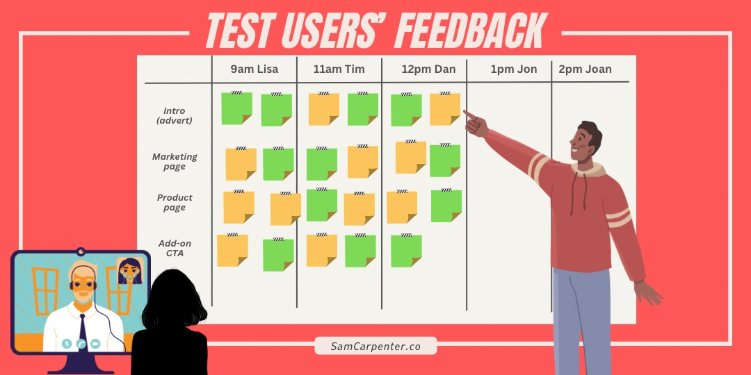 Meanwhile, the other interviewer is taking notes and sticking them in the corresponding area on the feedback wall. Use 2 different colour stickie notes, green for positive and affirming comments and orange for confusions or negative responses.