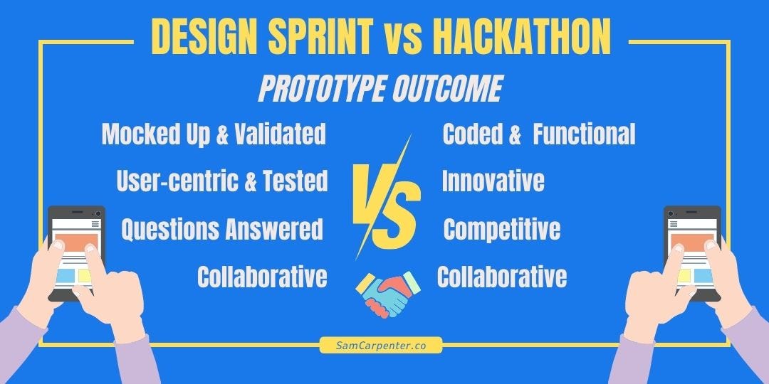 In summary, while both design sprints and hackathons are collaborative events aimed at generating solutions, design sprints focus on a structured problem-solving process with a user-centred design approach, whereas hackathons generally emphasise coding and the development of functional prototypes.
